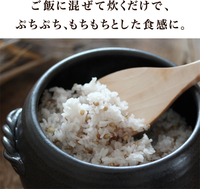 白米1合につき、するり麦を大さじ1杯を混ぜて炊くだけで、プチプチおいしい健康ごはん。