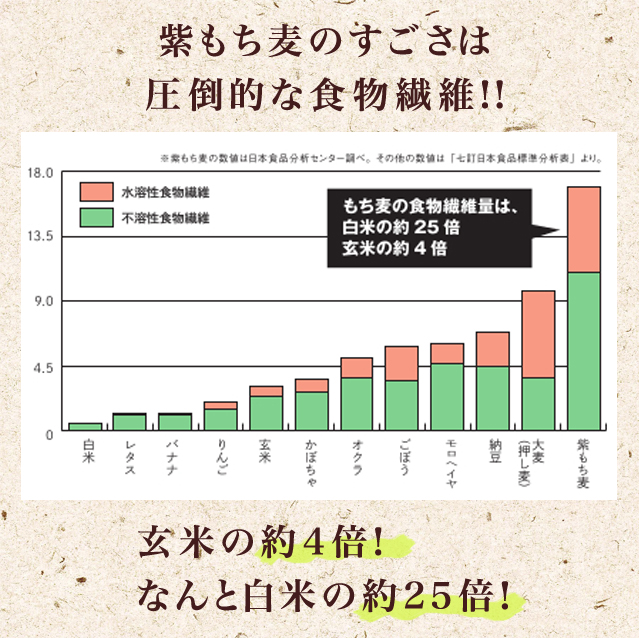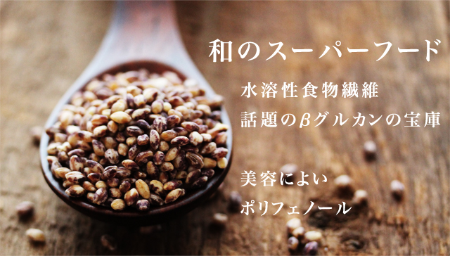 もち麦の中でも希少で、 国産の”ダイシモチ”という品種の紫色のもち麦がおススメ。すっきりをサポートする水溶性植物繊維、コレステロールや糖とたたかうβグルカンを含む他、若々しい毎日を支えるポリフェノールが豊富に含まれている。