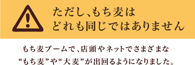 もち麦のような名前のうるち性の大麦 「もっち~◯麦」「もち◯ち麦」のような名前で販売されているが純粋な「もち麦」ではなく、うるち性の大麦の一種である場合が多い。もち麦と名前が似ているので、間違って購入しやすい。味にクセは無いがぷちぷちとしたもち麦の食感ではなく、よくある麦ごはんの食感に近い。