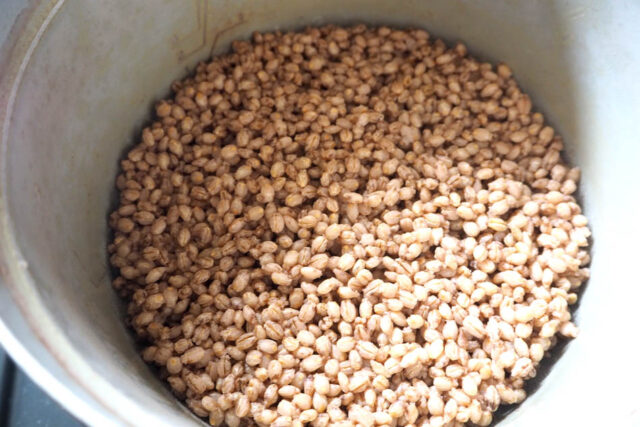 ゆでするり麦を作ります。お鍋にするり麦と水を入れ、強火で火にかける。沸騰したら中火にして、15〜20分程度水分がなくなるまでゆでる。